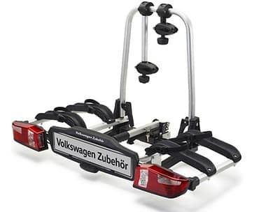 Portabiciclette flessibile e ampliabile per ganci traino per il trasporto di 2 biciclette. L’angolo di ribaltamento particolarmente ampio assicura l’accesso al bagagliaio, soprattutto nel caso del Caddy re del Multivan. Azionando la leva del pedale si attiva il meccanismo ribaltabile per l’apertura del bagagliaio, anche quando le biciclette sono già fissate al supporto. Ideale anche per il trasporto delle biciclette elettriche dato che l’ampia distanza tra le guide offre spazio a sufficienza per le batterie delle biciclette. Fissaggio intuitivo – posizionare il supporto sul gancio traino della vettura, spingere verso il basso la leva a mano e chiudere. Inoltre, la chiusura sulla leva protegge il portabiciclette dal furto. Gli innovativi distanziatori rimovibili con sicurezza antifurto e il bloccaggio rapido rendono il supporto particolarmente facile da usare. Dotato del portatarga originale Volkswagen e di cornici per supporto facilmente richiudibili, il supporto si chiude con facilità e si conserva in modo compatto. Kit di espansione per il trasporto di una 3a bicicletta disponibile in via opzionale.